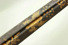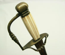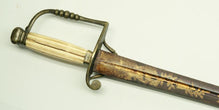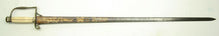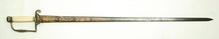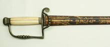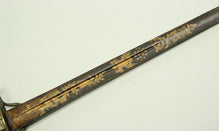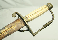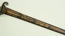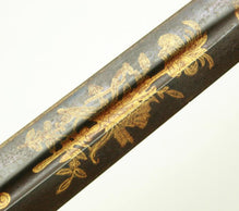 This early 19th c. American officer's pillow pommel sword is almost certainly a product of an English cutler. The quality of the blade and the fine execution of decoration are indicative of a good London or Birmingham maker. Blade is 33.5" long, of the broadsword variety, with a deep median fuller on either side, and is profusely decorated with the gilt imagery of American vernacular, Indian headdress, eagle, Phrygian cap, etc. The blue and gilt are covered with patina. The hilt shows traces of silver-wash, grip has a vertical split along the long axis on the back. This is a rarely seen type, dating to the the War of 1812.