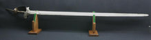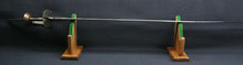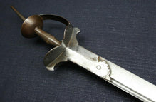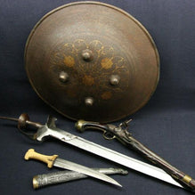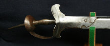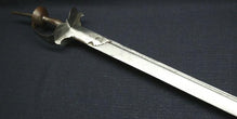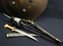 This heavy and tremedously long Indian firangi sword dates to some time in the 18th century, perhaps earlier. 126 cm-long overall, it is mounted with a whopping 105 cm or 41" long blade, single-edged, composed of pattern folded steel, with a nice damascus-like weave. Blade is still razor- sharp and shows signs of prior cleanings. Two-handed Khanda hilt of steel construction has acquired a beautiful dark patina. This is a wonderful sword for a collector of Indian and Islamic weapons. It would look great on the wall, next to a shamshir, a couple of kindjals, and a pair of holster pistols.