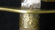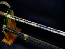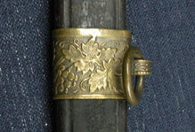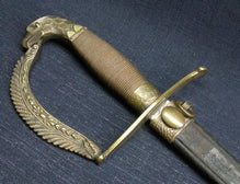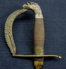 Completely conforming to the 1821 US Army Regulation for Infantry Officers, this pardon-styled sword has a silver-washed hilt [silver survives in protected areas] and a straight blade [about 29.5" long] . The hilt details are crisply-cast< with the knucklebow is in the shape of a feathered serpent, which is a rather uncommon stylistic element, and the eagle pommel being a text-book example of the Widman Style VI, according to the Mowbray book. The scabbard throat and mid-band repeat the hilt ferrule motif of intertwined grape leaves - another trade-mark feature of the Widman style. Blade is finely blued and gilded, with almost all of the decoration still on the blade, I'd say no less than 90% of blue and gild is present. Scabbard leather has shrunk a bit and is about 1\8 of an inch short of the blade, otherwise fine. An excellent sword for an advanced collector of American edged weapons.