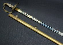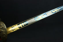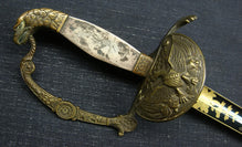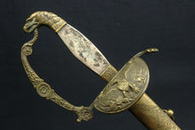 This outstanding American eagle pommel artillery officer's presentation-grade sword dates ca.1820-1830. 31" blade has the most beautiful, well-preserved blue and gilt decorations. Frosted etched panels feature classical floral decorations and portrait of Indian chief.
