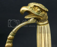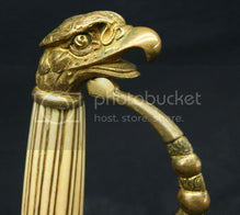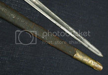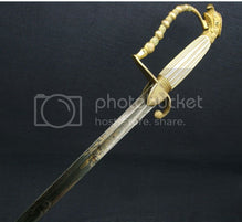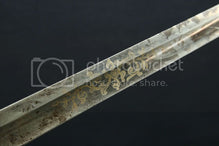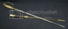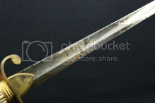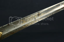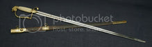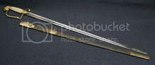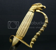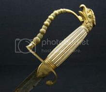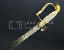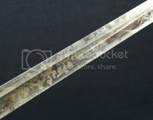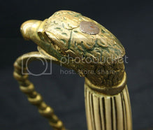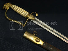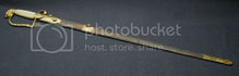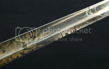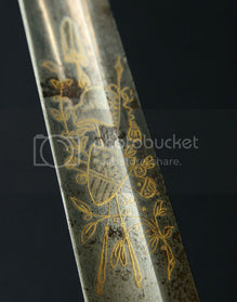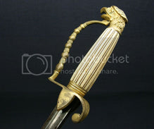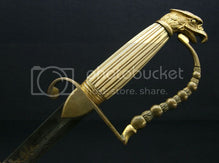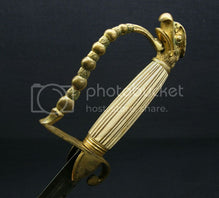 casting quality of the open-beaked eagle pommel and the flaming grenades knuckle bow is very good, with a great deal of fine detail. Gilding of the hilt is in fine condition. Blade is 30" long, blued, gilded, and decorated in the American vernacular and military motifs. Scabbard leather has shrunk over time, and is now about 1/3" short. Judging by the character of the hilt, this sword was made in London or Birmingham.