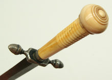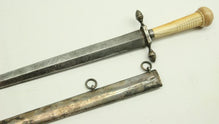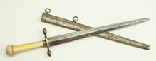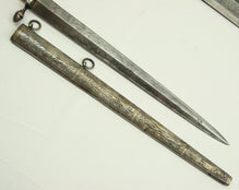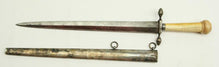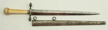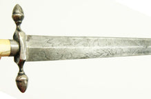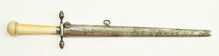 This naval officer's or midshipman's dirk dates to the early decades of the 19th century. Blade is 23 cm long, etched on both sides in floral and coral motifs for more than half its length. The furniture of the hilt as well as the scabbard is sterling silver. The grip is now nicely age-toned. The quillons are in the shape of acorns. The scabbard is engraved with palmettes and branches. The cross-guard is a bit loose.