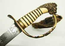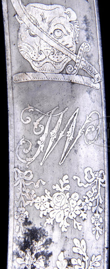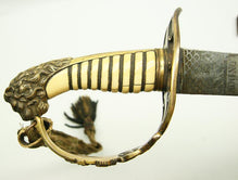 This superb British 1803 Pattern rifle infantry officer's sword is etched with initials JW and the family crest in the form of leopard's head cut through its left side with a scimitar, the crest of the Wadmore family, to which it was granted in 1602. The sword belonged to James Wadmore, captain of the St.Pancras Volunteers, a London-raised infantry regiment.