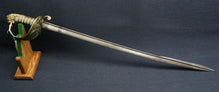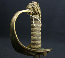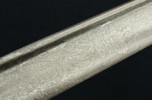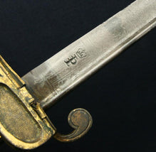 Prosser died in 1838, which dtes this sword ca. 1827-1838. It is mounted with a curved pipe-back blade on a massive, well-cast hilt. Blade is 71 cm long, and has acquired a nice uniform patina, with several minor spots of pitting and several light nicks on the edge. Blade is extensively decorated in Royal regalia and naval symbols, and is prominently maker-marked.