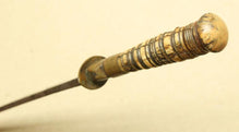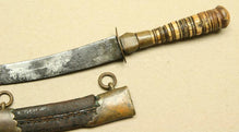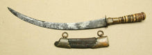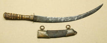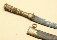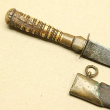 This early 19th c. British midshipman's dirk is 28 cm-long, and is mounted with a 20 cm-long curved blade that has acquired a nice dark patina, as have all the other parts of the dirk. Original scabbard upper half survives. Dirk shows generalized honest wear.