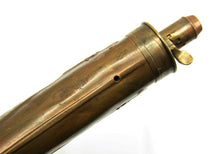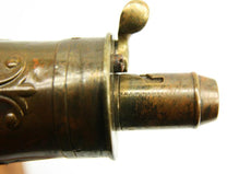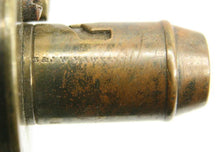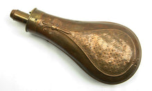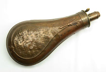 This English G & J.W. HAWKSLEY-made powder flask is 7.5' long from bottom to tip of spout. The bottom loop holes were period-sealed, while the top two loop holes remain open. Mechanism functions fine. A wonderful patina on this piece!