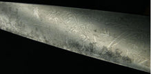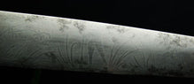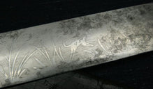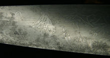 Reverse side of the blade is decorated with another hunting scene, picturing a hunter with a hunting spear, a deer that is about to die, and a hunting dog. Two other deer are running away, towards the point of the blade.