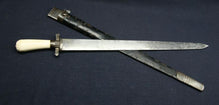 Original leather over wood scabbard is in fine shape, with some scoffs and scratches. Scabbard mounts are en suite with the hilt. An old collection or museum tag is attached to the locket. A museum-quality piece.