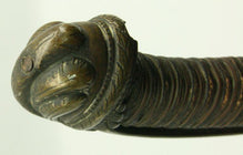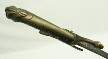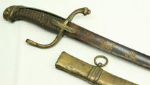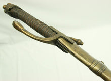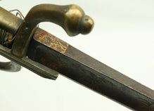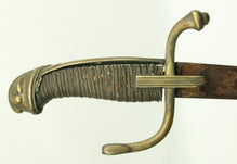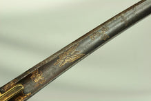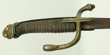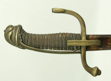 This French cavalry officer's sword dates ca.1785-1795, and is mounted with a 84 cm blade, which retains vestiges of the blue and gilt, and has nicks along the edge. The pommel is in the shape of the Roman helmet. Upper half of the knuckle bow has been period-removed, which allowed for a quicker grasp. The scabbard has a small split along the seam on one side of the throat, and the throat piece is long gone. Hilt is loose. Overall this is a satisfying, honest late Louis XVII or early French Revolutionary War Hussar officer's sword, and is attractively priced.