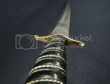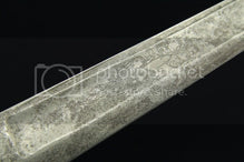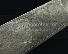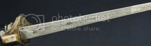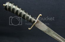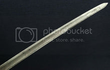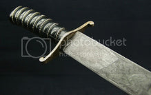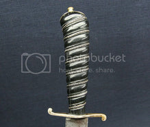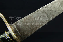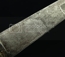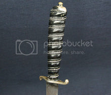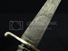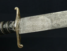 This fine mid-eighteenth century French couteau de chasse sword is mounted with a 55 cm-long blade, engraved on both sides, at the forte. Among the decorations are a crown with an axe below it, perhaps a family crest of the sword's owner, perhaps a secret society symbol. The reverse side of the ricasso is inscribed DE LA FABRIQUE A SOLINGEN, with some writing below that, which I wasn't successful in deciphering. Back of the blade features a long arrow, a known talismanic symbol. Hilt is mounted with a re-curved solid silver cross-guard of significant thickness, silver wire is entwined around ebony grip, grip is surmounted with a solid silver pommel.