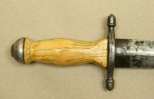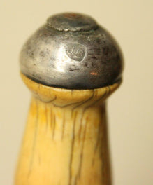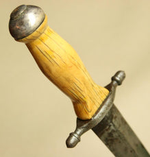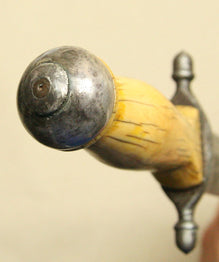 The cross-guard is steel, with acorn-shaped quillons. The grip has acquired a fine uniform patina and age craquelure. The pommel cap is sterling silver, hall-marked with a maker's cartouche J*B. A nice touch is the presence of a thin sterling silver washer between the grip and the cross-guard, a feature I haven't seen before.
