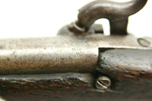 This N.P.Ames-made USN M1842 percussion box-lock pistol is maker-marked on the lock plate. Trigger guard is marked with an inspector's cartouche, as is the barrel. An old veteran, it exhibits honest age and wear. The pistol is in the standard .54 caliber, with a 6" barrel, and has an uncommon brass front post sight. The back button on the captive ramrod is long gone, and it now slides out of its swivel. Pistol doesn't hold the cock, the lock is complete, with no missing or replaced parts. Internal lock parts are all original and complete. There is a discrete very well done period repair to the stock under the lock plate.